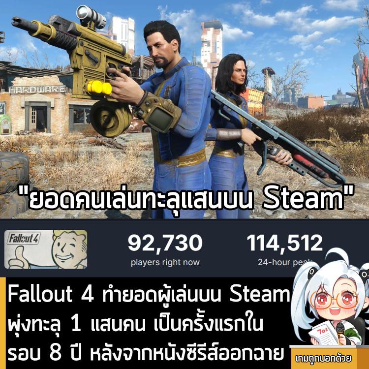 ล่าสุดจากรายงานของ SteamDB ระบุว่า Fallout 4 สามารถทำยอดผู้เล่นพร้อมกันบน Steam ได้แล้วถึง 114,512 คนในช่วง 24 ชั่วโมงที่ผ่านมา แม้ยอดดังกล่าวจะยังเทียบไม่ได้กับยอดสูงสุดตลอดกาลที่เคยทำไว้ 472,962 คน แต่ก็ถือว่าเป็นยอดผู้เล่นทะลุ 1 แสนคนเป็นครั้งแรกในรอบ 8 ปีเลยทีเดียว